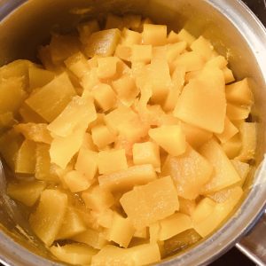 Don’t be put off by its size! The easiest way to prepare this beautiful vegetable is to give it a good wash and then cut into slices, as you would a melon, with a sharp knife. You can then pull the seeds out from the centre of each slice and carefully remove the skin. Chop through the slice to make cubes. These can be kept in the fridge for a couple of days, or frozen to use at a later date.