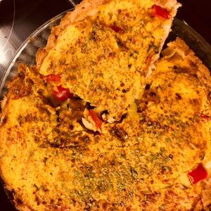 Pour the egg and squash mixture over the vegetables and sprinkle with dried, chopped chives, black pepper and a little Himalayan pink salt. Bake at 175 degrees Celsius for 15-20 minute or until filling has set.